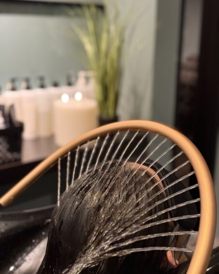 Nadat je plaats hebt genomen en je comfortabel ligt beginnen wij met de scalpscrub, zo verwijderen wij dode huidcellen en masseren wij de hoofdhuid mooi schoon.